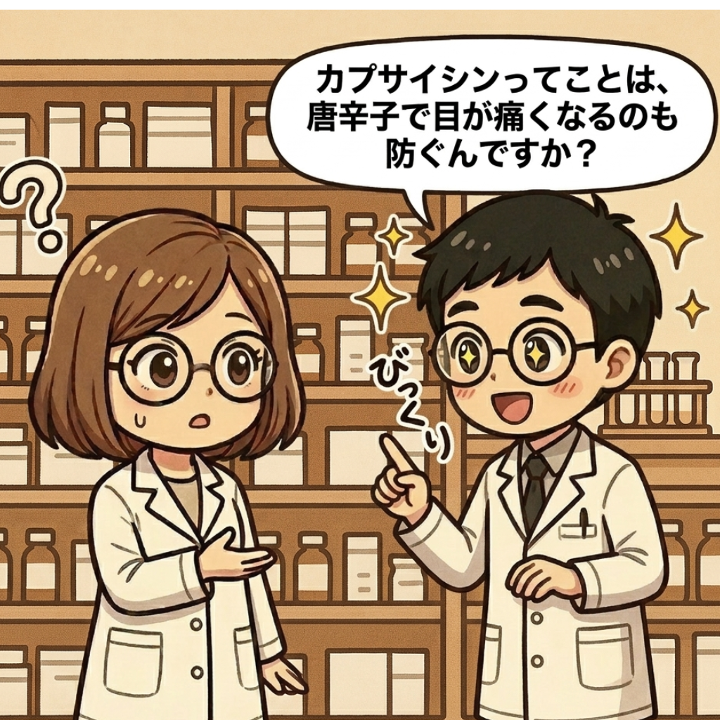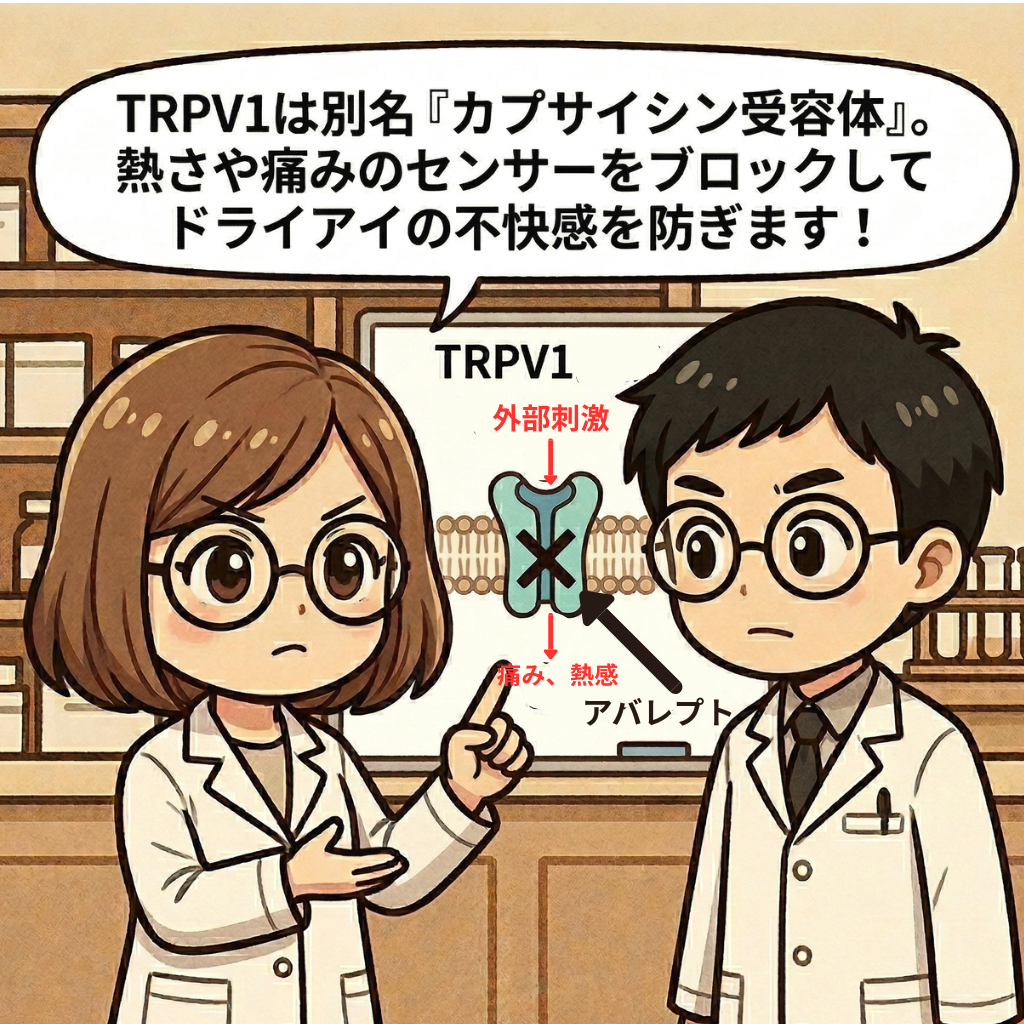 アバレプトの作用機序であるTRPV1(Transient Receptor Potential Vanilloid 1)拮抗作用は、別名「カプサイシン受容体」とも呼ばれ、熱さや痛みを感知するセンサーです。これをブロックすることで、ドライアイによるゴロゴロ感や痛みを抑えます。
