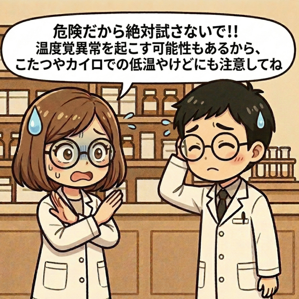 目薬なのに全身の温度感覚が鈍くなり、低温やけどのリスクが高まるという、非常に珍しいお薬です。服薬指導の際は、以下のようにお伝えしましょう。