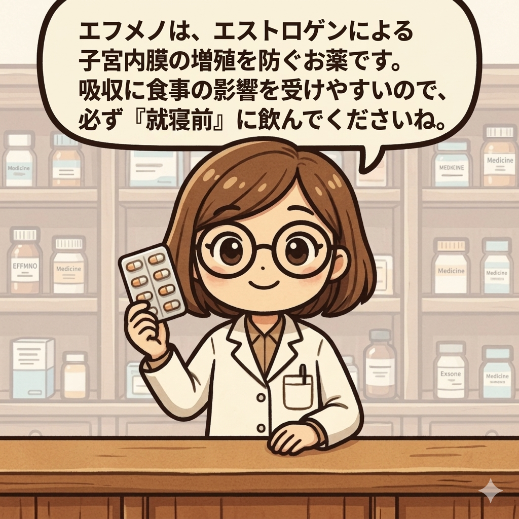 そこで、**「子宮内膜の増殖を抑えるブレーキ(盾)」**として、黄体ホルモンであるエフメノがセットで処方されます。