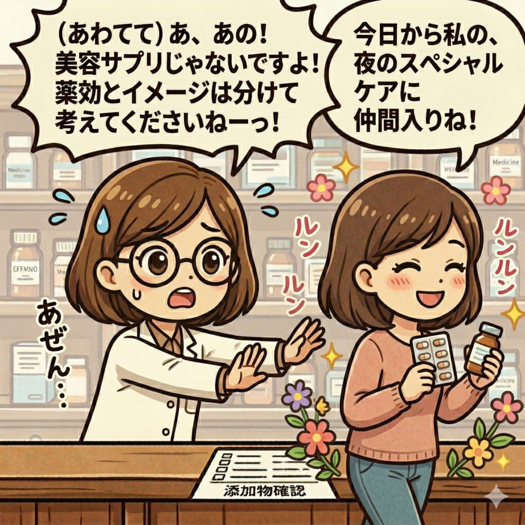 現場では、**「お薬の形を作るための添加剤として少し使われているので、念のためアレルギーがないかの確認です」**と、確認の目的を明確にお伝えすると安心していただけます。