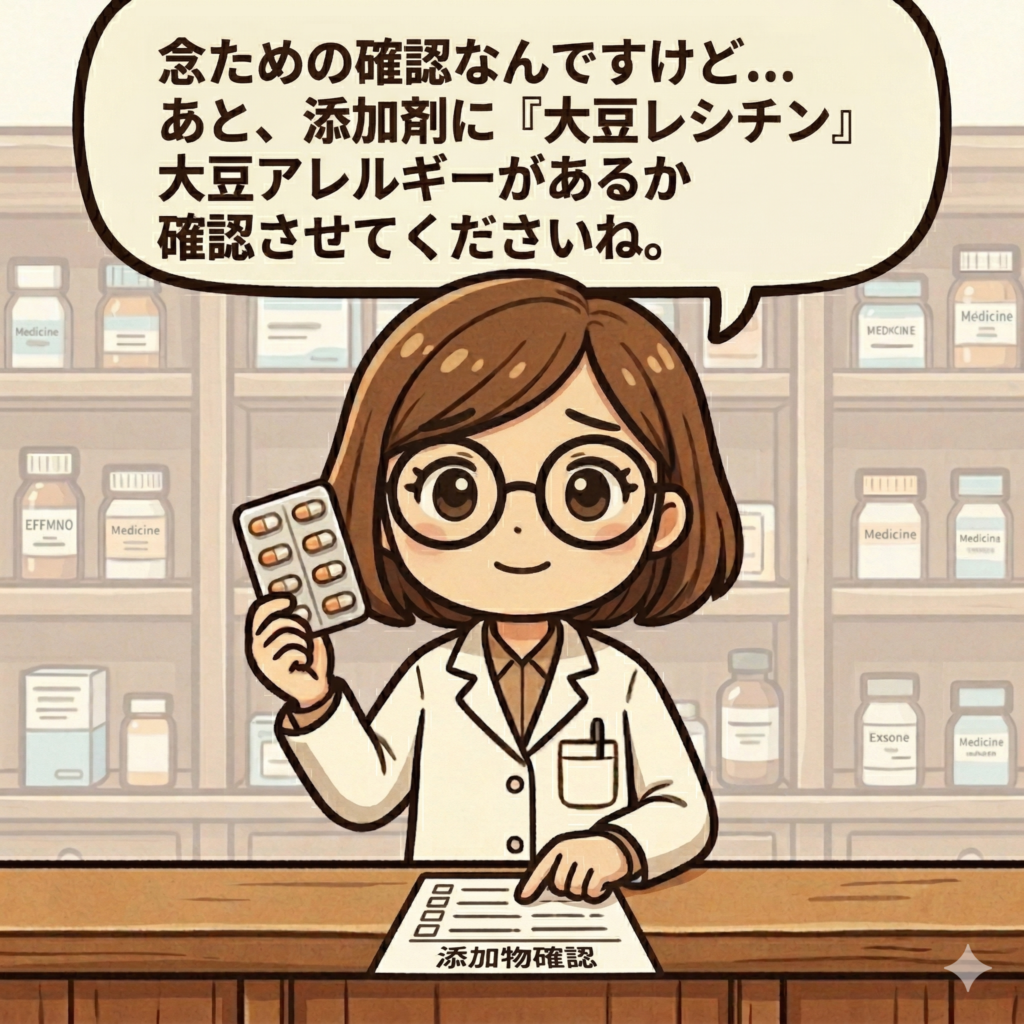 有効成分そのものが大豆というわけではありませんが、大豆アレルギーの既往がある患者さんには注意が必要です。初回の服薬指導では、アレルギーの有無をしっかり確認しましょう。