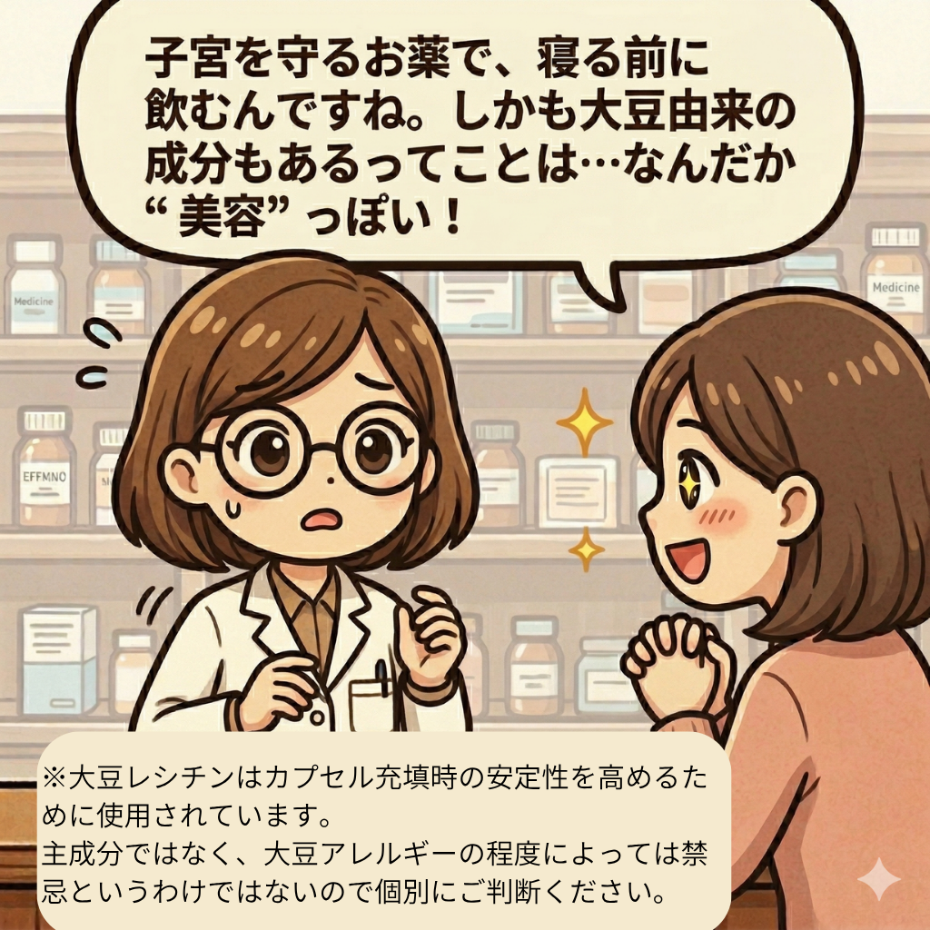 漫画の2コマ目にも登場しましたが、エフメノカプセルには添加剤として**「大豆レシチン」**が含まれています。