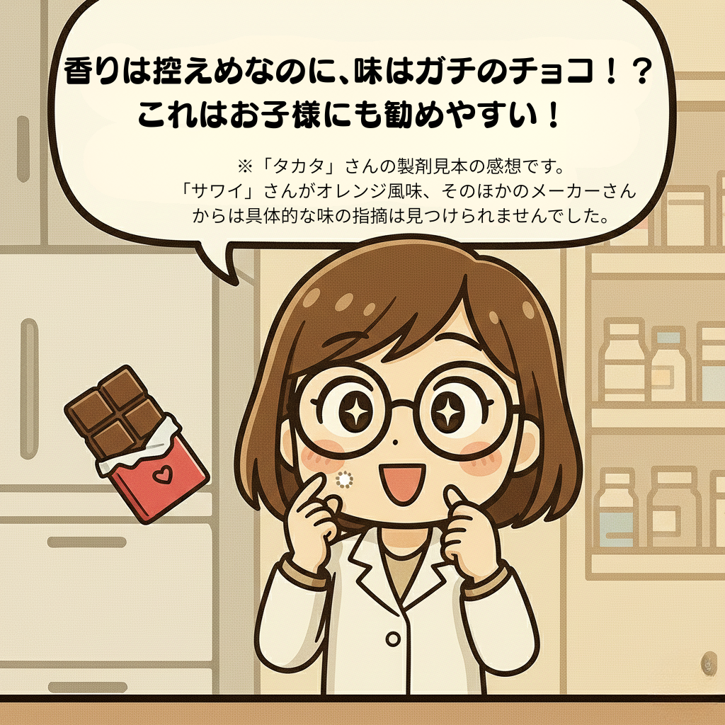 - 味の設計: しっかりとした「チョコ風味」を付けることで、薬剤の苦味と味のトーンを同調させています。