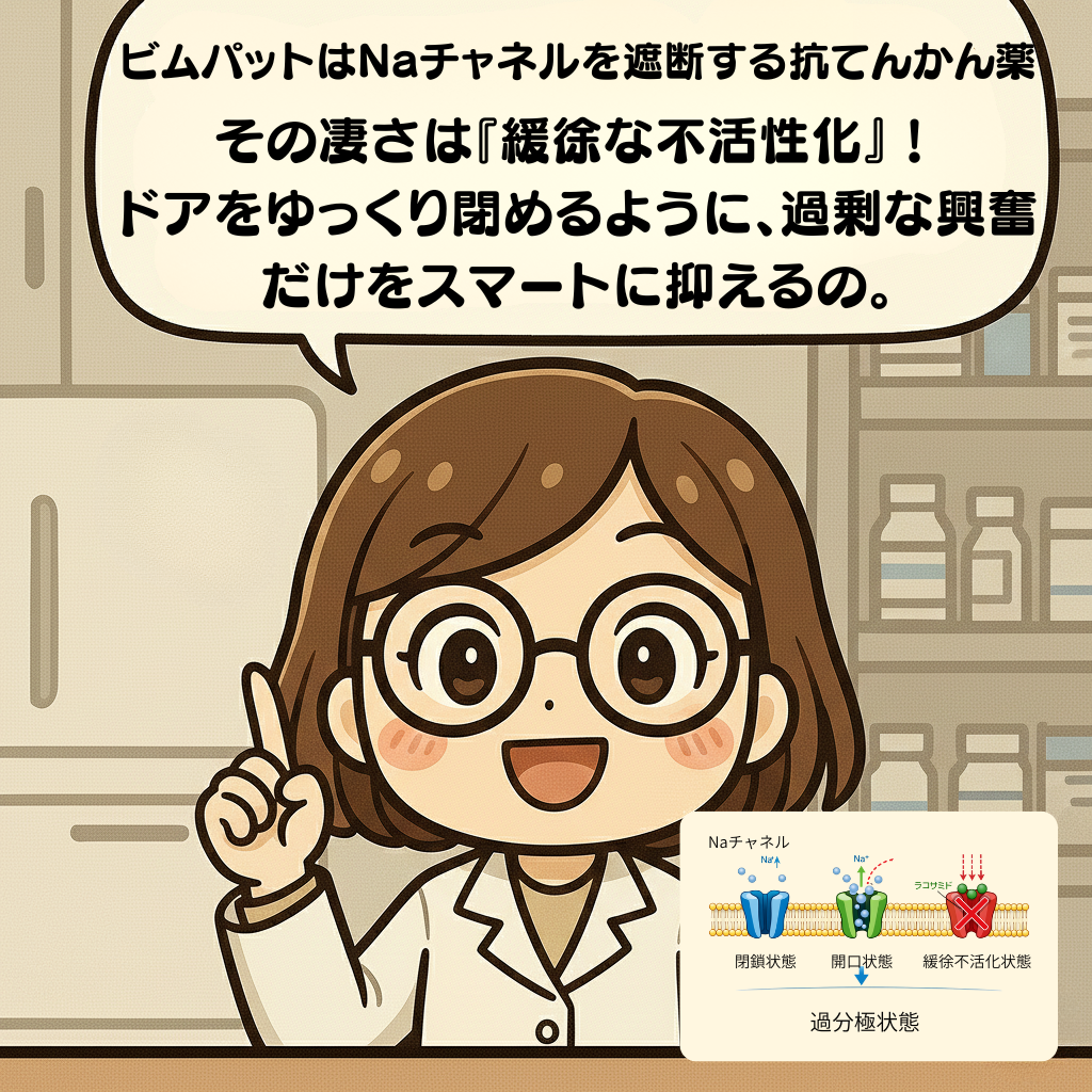 今回の漫画では、抗てんかん薬**ビムパット(一般名:ラコサミド)**にスポットを当てました。
