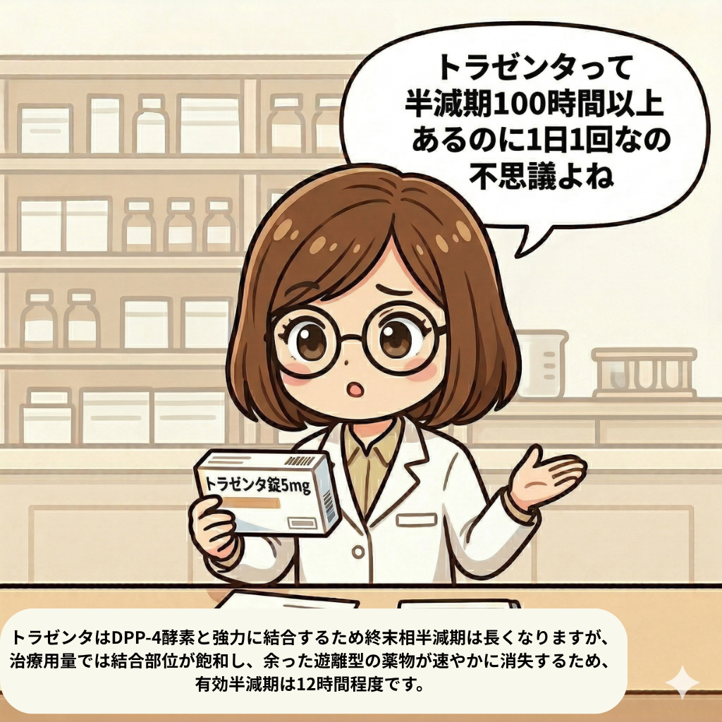 トラゼンタの「半減期100時間以上」の理由はDPP-4への強力な結合(TMDD)によるもので、実質的な有効半減期は約12時間のため過剰な蓄積の心配はありません。