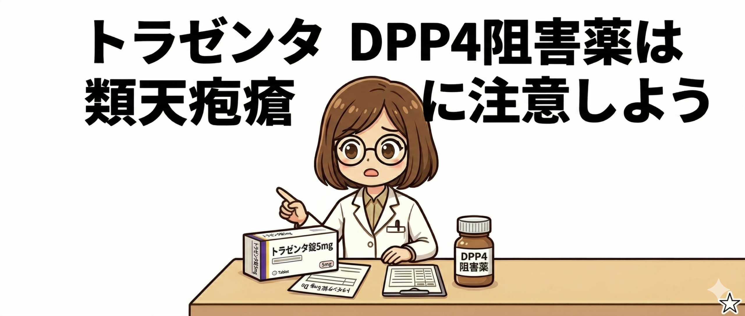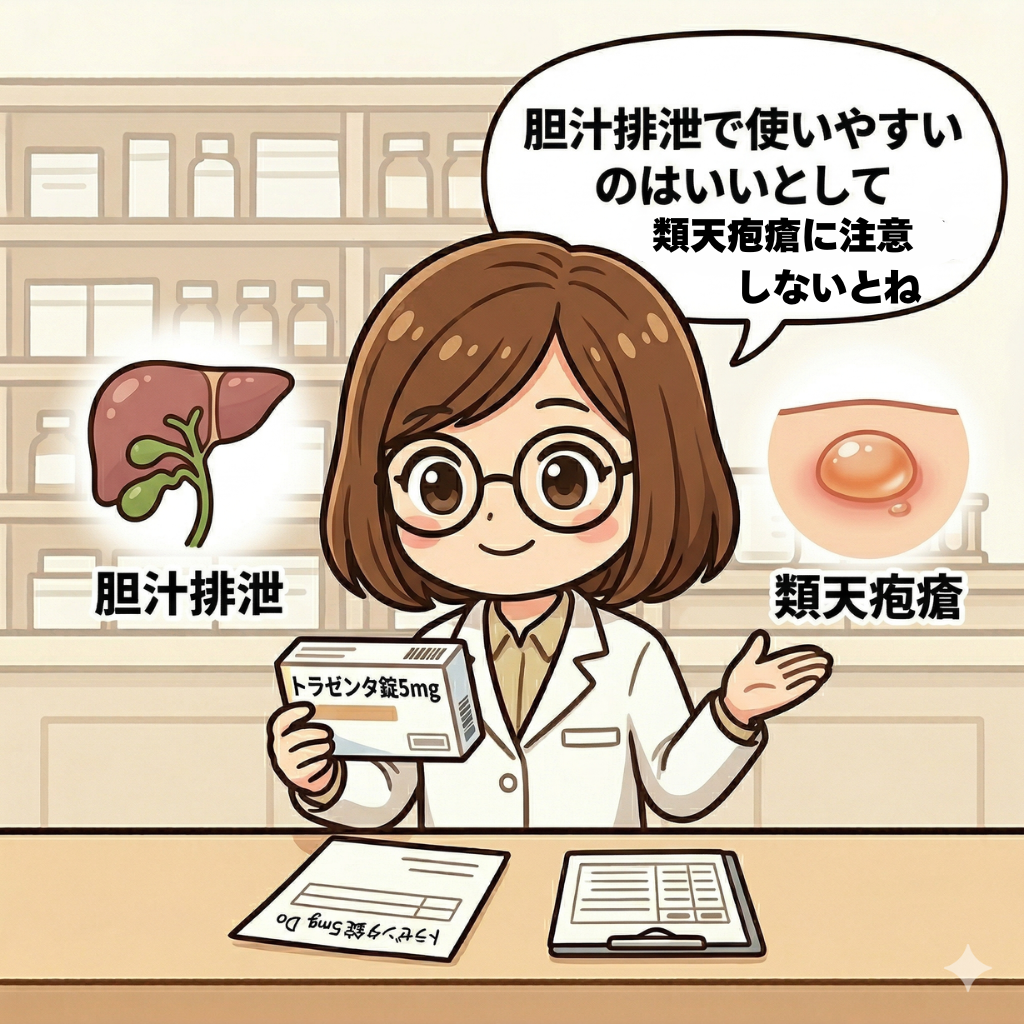 今日はトラゼンタ錠を振り返りましょう。糖尿病治療薬として低血糖に注意するのはもちろんですが、類天疱瘡にも注意しましょう。