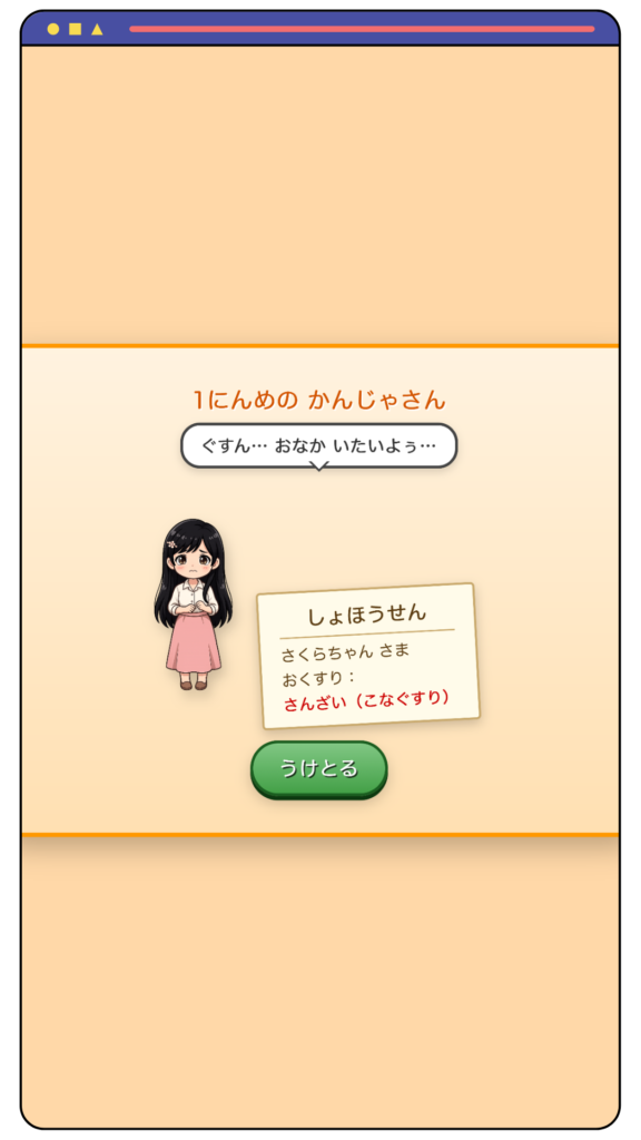 患者さんのイラストを見ながらお話を聞いて、お薬を準備する体験ができるミニゲームになっています。ブラウザで動くので、アプリのダウンロードなどは不要ですぐに遊べますよ😊